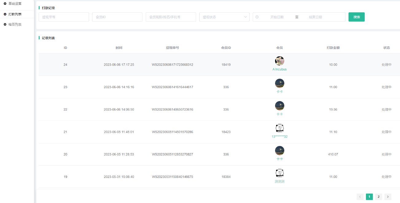 3. 打款列表:记录会员打款信息