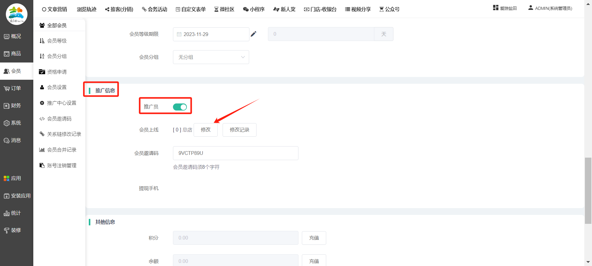目录 搜索 展开 一、前期准备资料二、数字乡村码-上线操作指南1、服务号的申请流程及认证2、申请小程序流程3、开放平台绑定小程序和公众号三、数字乡村码-系统操作数字乡村码系统管理-概况数字乡村码-商品管理1、发布商品2、商品列表3、商品表单4、商品分类5、品牌管理6、配送模板7、评论管理8、优惠券管理9、商品标签10、退货地址设置11、满额优惠12、批量操作13、配送方式14、基础设置15、商品隐藏四、数字乡村码-会员管理1、全部会员2、会员等级3、会员分组4、资格申请5、会员设置6、推广中心设置7、会员邀请码8、会员关系链修改关系链修改记录9、会员合并记录10、账号注销管理11、会员设置中心五、数字乡村码-订单管理1、订单管理列表2、订单处理流程3、订单状态4、订单修改价格5、订单退款退货6、多包裹发货7、批量发货订单操作步骤8、催发货订单9、物流查询六、数字乡村码-财务管理1、余额设置2、会员余额3、充值记录4、转让记录5、余额明细6、收入明细7、提现设置8、提现统计9、积分管理10、转账审核11、收益广告12、批量充值七、数字乡村码-系统管理1、商城入口2、商城设置①、商城设置②、订单设置③、物流查询④、短信⑤、联系方式⑥、分类⑦、优惠券⑧、分享⑨、幻灯片⑩、广告位⑫、地图设置3、交易设置4、微信模板消息自定义消息模板(新版)自定义消息模板(旧版)小程序消息模板公众号模板消息变更公告5、语言设置6、权限管理7、多媒体管理八、数字乡村码-消息管理九、数字乡村码-应用管理十、数字乡村码系统-数据统计十一、数字乡村码-页面装修DIY1、模板管理2、店铺页面3、顶部导航4、底部导航5、DIY模板市场6、首屏广告7、基础设置8、装修DIY尺寸建议十二、供应商功能插件操作指南1、供应商2、门店-收银台门店申请和使用步骤门店管理①、门店-收银台 营销设置②、门店-收银台 分润设置门店分类门店申请门店审核门店商品门店商品订单收银台订单数据统计核销员基础设置默认设置门店装修3、微社区4、会务活动十三、营销插件操作指南活动报名提货卡新人奖微店问卷调查积分视频分享1、视频分享基础设置2、视频分享发现管理3、视频分享分类管理4、视频分享评论管理5、视频分享分红记录6、视频分享短视频中心每日红包幸运大抽奖签到优惠券二维码任务奖励优惠劵文章音频文章付费文章限时购新海报拓客卡操作流程积分活动素材中心视频红包十四、入驻门店应用类1、门店预约2、附近商品3、门店定位设置4、门店控制5、门店满额包邮6、门店满额减7、导入商品8、门店搜索9、门店股东10、核销券11、多门店核销1、商城后台设置2、前端功能演示十五、常见问题1、后台登录密码修改流程2、会员-余额,积分,后台如何进行充值与扣除3、如何修改上下级关系4、一种万能的获取商城小程序路径的方法 暂无相关搜索结果! 阅读次数:1446 本文档使用 模王系统 发布 8、会员关系链修改 8、会员关系链修改一.如何修改上下级关系?1.会员-全部会员-可以通过搜索用户的独立ID,或者用户微信昵称,找到此会员,然后点击右边的(操作)2.再点击会员详情。3.滑到下面,有个推广信息-会员上线,点击修改4.输入上级的ID号,点击搜索,出来此上级会员后点击选择。5.滑到最下面,一定要点击提交按钮。文档更新时间: 2023-11-30 14:56 作者:链上旅行